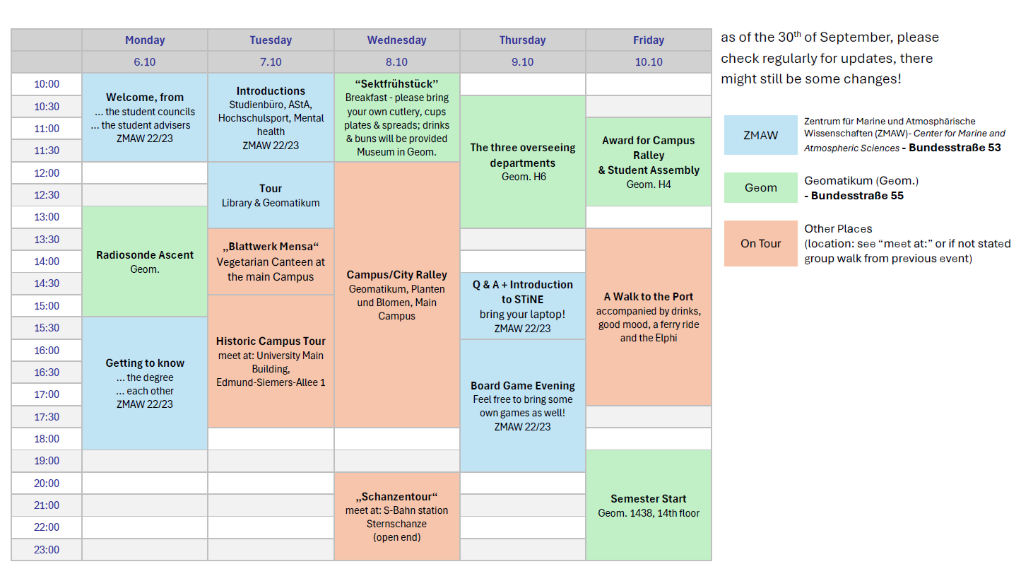 First-semester students are welcomed in the orientation week, which usually takes place in the week before the regular lecture period starts. It is particularly designed for first-semester students in the B.Sc. Earth System Physics and is organized by current higher-semester students. We will provide you with all the information regarding the BSc program, lectures, course registration, etc., as well as guide you through some of the steps. Additionally, you will get the chance to get to know the city, the university and the campus. We also offer some social activities like a potluck breakfast and evening get-togethers – surely nice opportunities to get to know your fellow students!